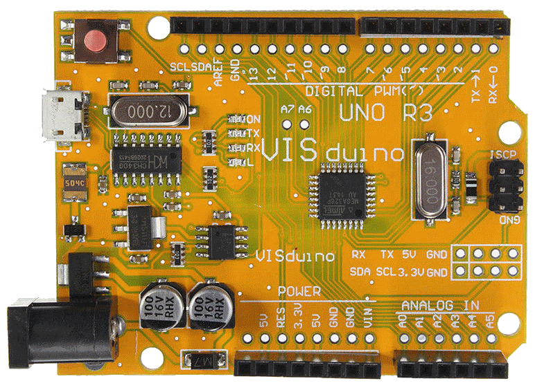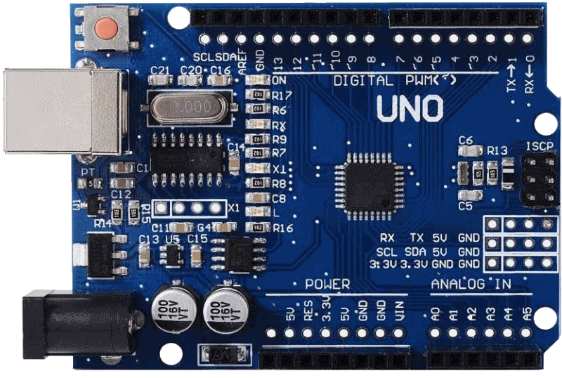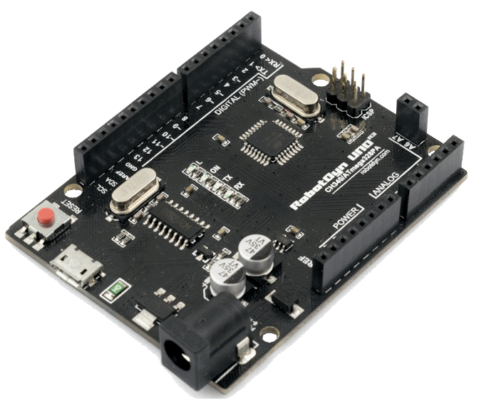 C’est l’Arduino standard, le plus utilisé mais le microcontrôleur (ATMega328P) ne gère pas la communication en USB, il doit donc utiliser une puce secondaire (atmega16u2, CH340, CH341 ou FTDI)