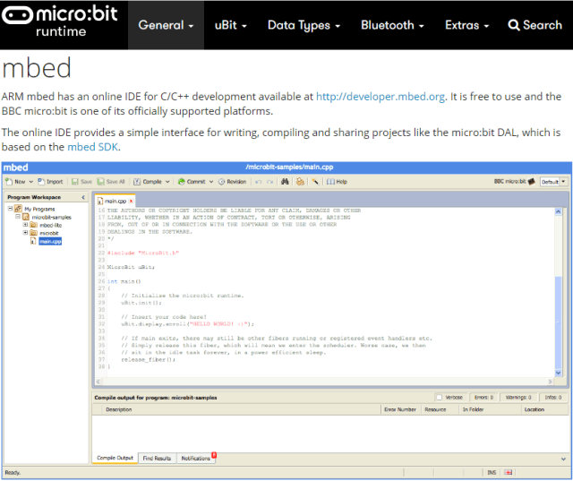 Accessible en ligne sur le site de la fondation, il s’adresse aux utilisateurs plus avancés que MakeCode. Mais le principe reste le même. Une fois le programme tapé, vous téléchargez le fichier hex qu’il suffit ensuite de copier dans le Micro:bit. La documentation (en anglais) est disponible ici.