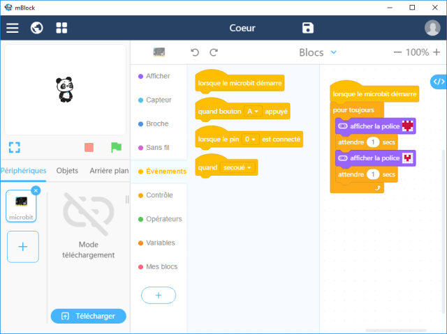 Une fois que le programme vous convient, il suffit de cliquer sur le bouton « Télécharger » et de copier le fichier (.hex) obtenu dans le Micro:bit comme s’il s’agissait d’une clé USB (ou clic droit et Envoyer vers).