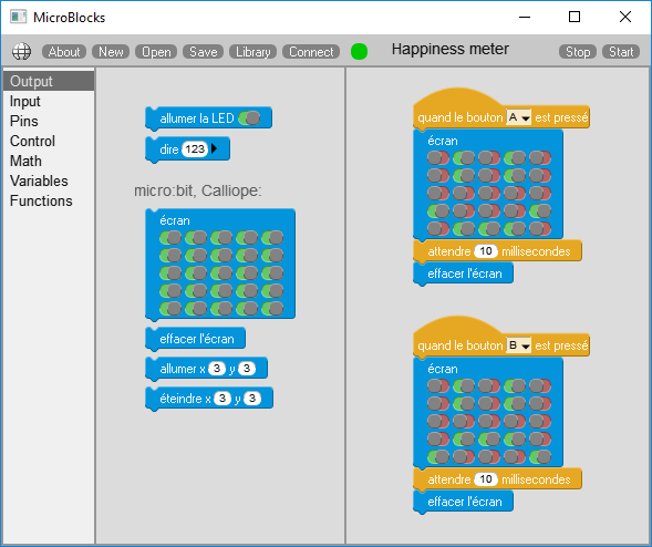 C’est un langage de programmation par block (inspiré de Scratch). Il faut l’installer sur l’ordinateur mais ensuite il ne nécessite pas de connexion internet. Il permet aussi d’uploader (téléverser) directement le code vers le Micro:bit. Actuellement, il est encore en version alpha, ce qui explique pourquoi il n’est que partiellement traduit (l’interface est en anglais mais les blocs en français). Cela dit il est déjà fonctionnel. Vous pouvez le télécharger ici.