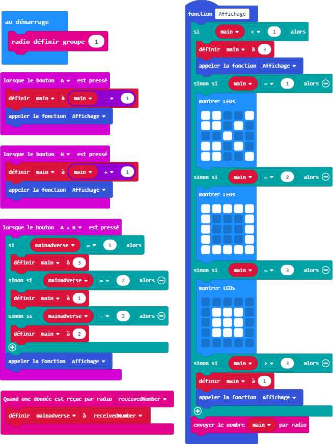 En appuyant sur les boutons A ou B, vous faites défiler à l’écran (la matrice 5×5), les 3 symboles (pierre, papier ou ciseaux). Théoriquement vous avez autant de chances que votre adversaire de gagner, mais le Micro:bit transmet discrètement l’information en bluetooth à son homologue. Le « truc« , consiste à appuyer en même temps sur les boutons A et B pour que le Micro:bit choisisse automatiquement le symbole qui vous fera gagner.