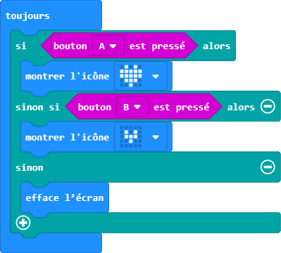 Pour utiliser les boutons, il faut créer une boucle infinie, dans laquelle le Micro:bit vérifie en permanence si l’on a appuyé sur un des boutons.