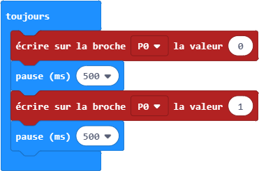 Concernant le code, c’est simplement une boucle infinie qui met alternativement la borne P0 à 0 (GND) ou 1 (+3,3 V) avec une pause de 500 millisecondes (1/2 seconde) entre chaque modification.