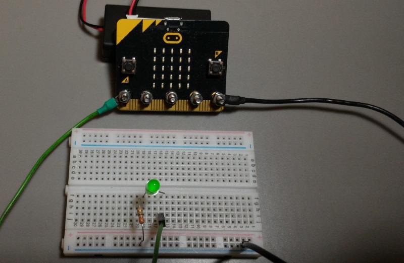 Les ports P0, P1 et P2 du Micro:Bit peuvent être utilisés en entrée ou en sortie. Dans cet article, nous allons utiliser le mode sortie pour contrôler une LED, d’abord en numérique (0 ou 1) et ensuite en analogique (de 0 à 1023).