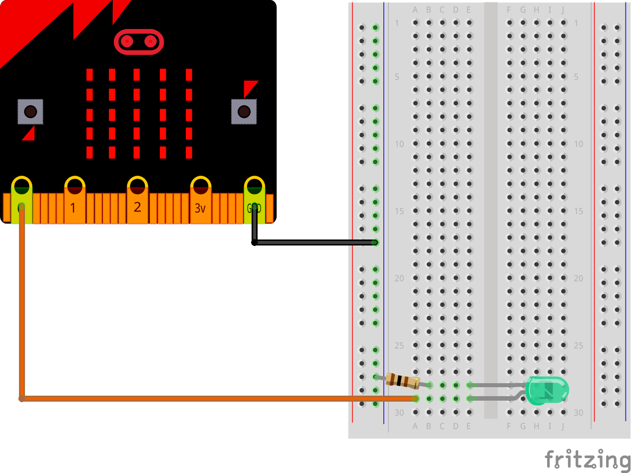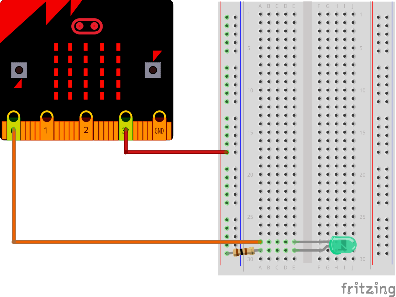 Précédemment, nous avons vu comment connecter le Micro:Bit à une breadboard. Je vous propose donc de reproduire ce schéma avec une LED et une résistance de 100 à 220 Ω (Ohm). La résistance est obligatoire car elle permet de protéger la LED. Attention, la LED ne fonctionne que dans un sens, la patte la plus longue doit être reliée à la borne plus (3,3 V) et la plus petite à la borne moins (GND).