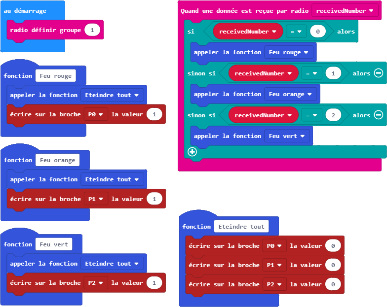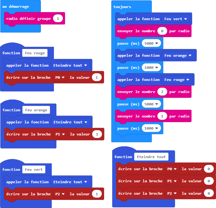 Souvent, sur les vrais feux de chantier, il y a en plus un compte à rebours pour faire patienter l’automobiliste en lui indiquant dans combien de temps le feu passera au vert. Si vous souhaitez aller plus loin, vous pouvez utiliser la matrice de LED pour indiquer sur chaque Micro:Bit, le nombre de secondes avant qu’il passe au vert. Amusez-vous bien…