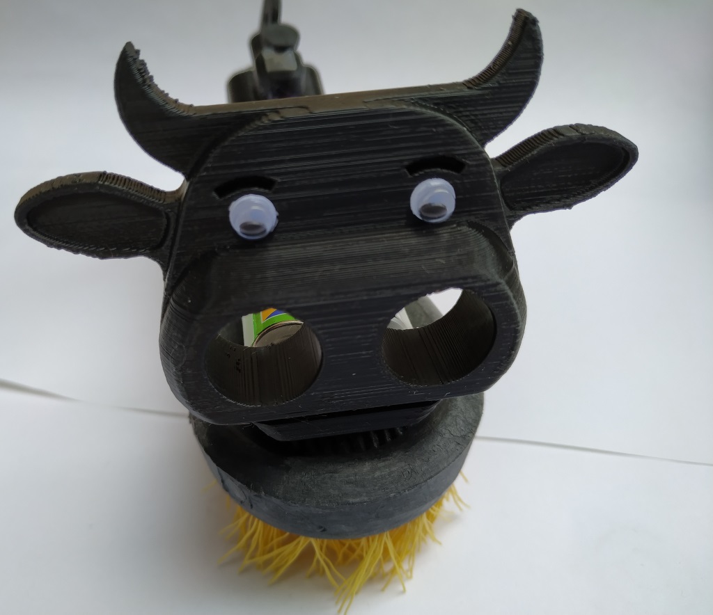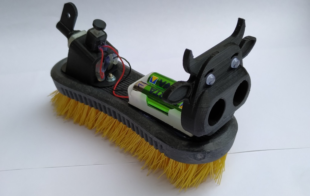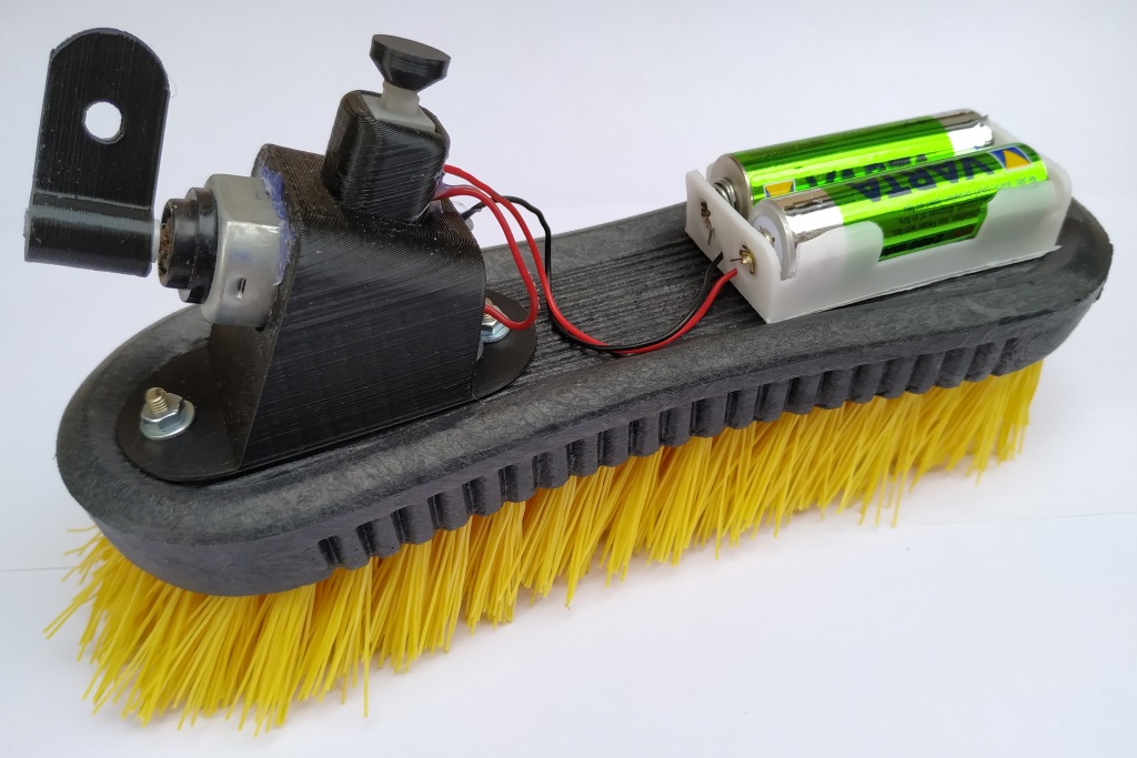 Pour fabriquer votre robot, vous avez simplement besoin d’une brosse, d’un moteur et d’une alimentation électrique. Vous pouvez ajouter un interrupteur, c’est plus pratique pour arrêter le robot (sinon retirez simplement les piles). Les quelques pièces imprimée en 3D sont disponibles sur Thingiverse. Mais vous pouvez aussi faire la même chose en bois, en carton et avec de la colle chaude.