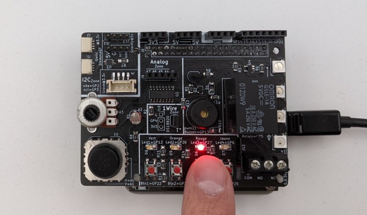 Avec le Ludik Hat, c’est encore plus facile puisqu’il intègre presque tout les composants nécessaires et que les boutons sont parfaitement placés en face des LED (c’est une coïncidence ou c’est fait exprès ?). Il manque juste le microcontrôleur, mais il suffit de relier la carte au PicoHat (ou d’adapter le programme au Raspberry Pi).